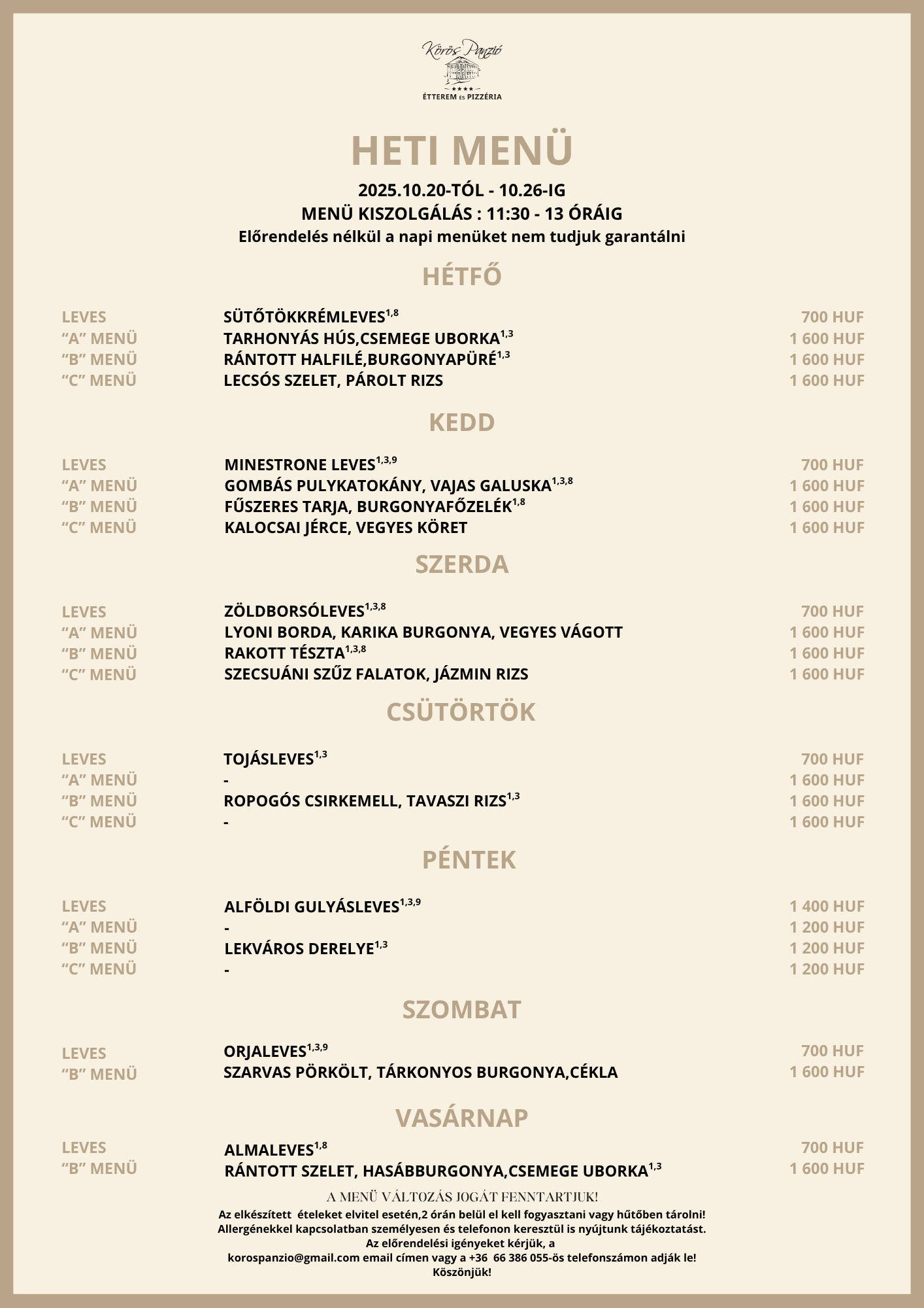 Továbbá tájékoztatjuk Önöket, hogy a menüváltozás jogát továbbra is fenntartjuk. Előrendelés nélkül a napi menüket nem tudjuk garantálni.