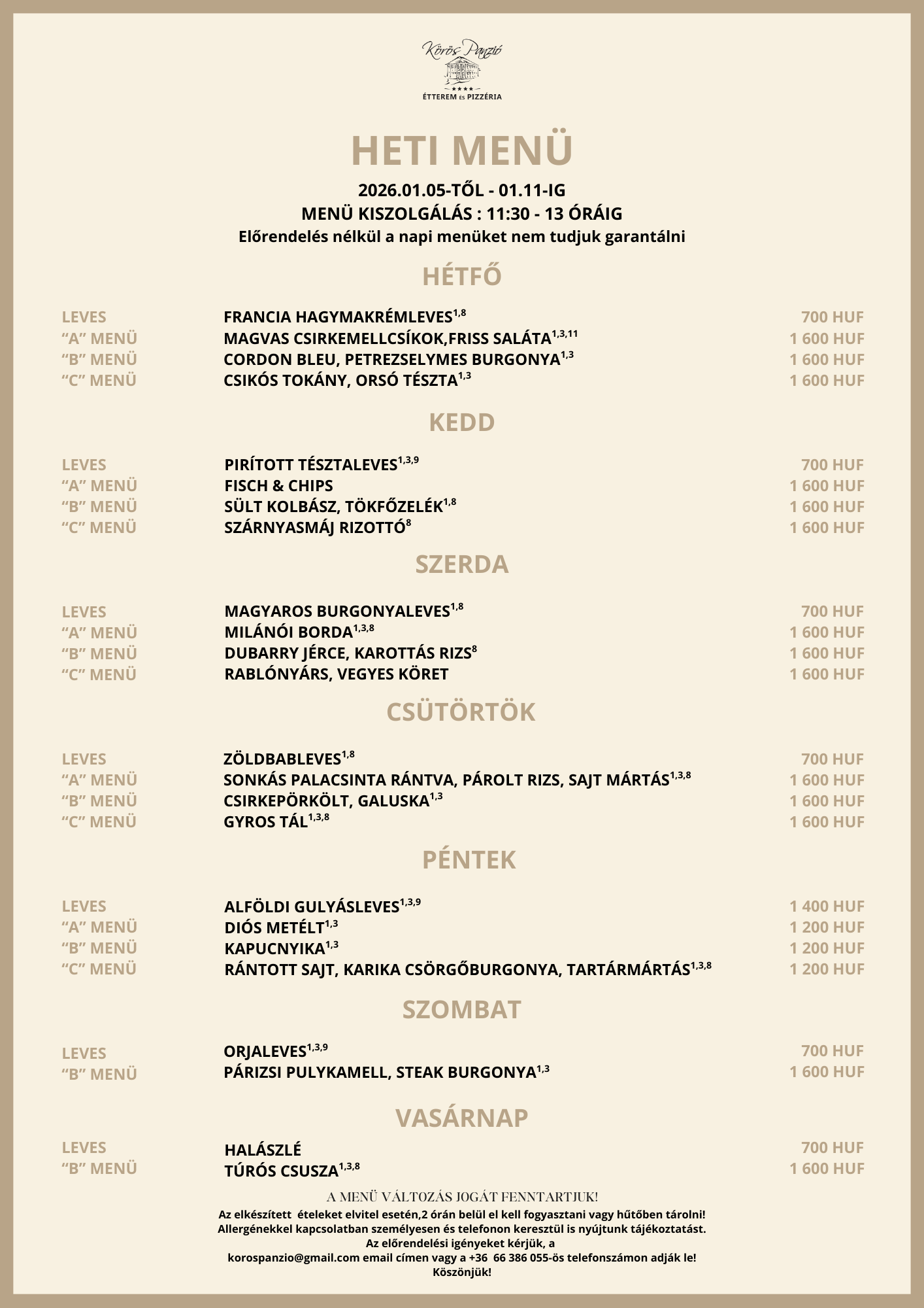 Továbbá tájékoztatjuk Önöket, hogy a menüváltozás jogát továbbra is fenntartjuk. Előrendelés nélkül a napi menüket nem tudjuk garantálni.