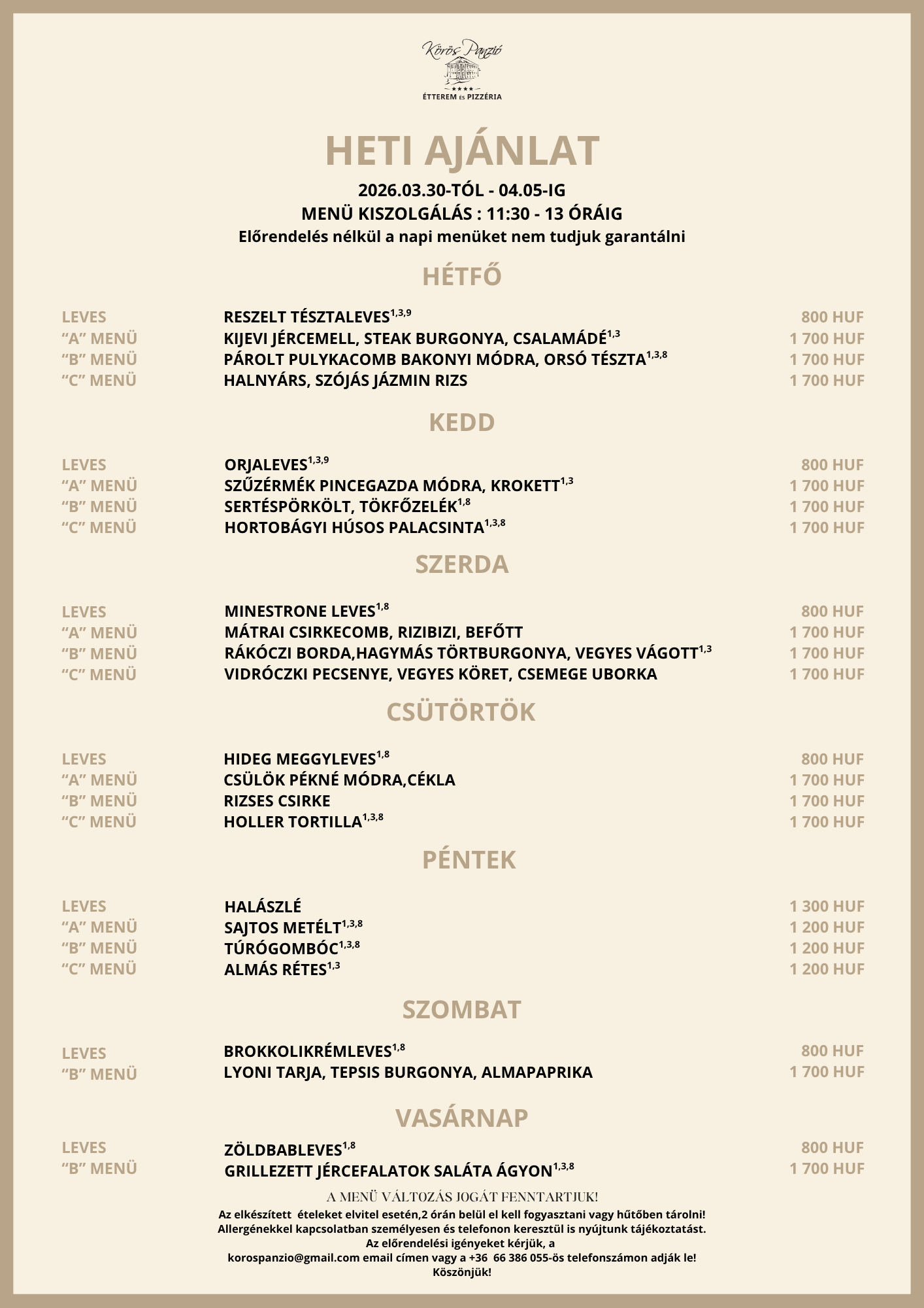 Továbbá tájékoztatjuk Önöket, hogy a menüváltozás jogát továbbra is fenntartjuk. Előrendelés nélkül a napi menüket nem tudjuk garantálni.