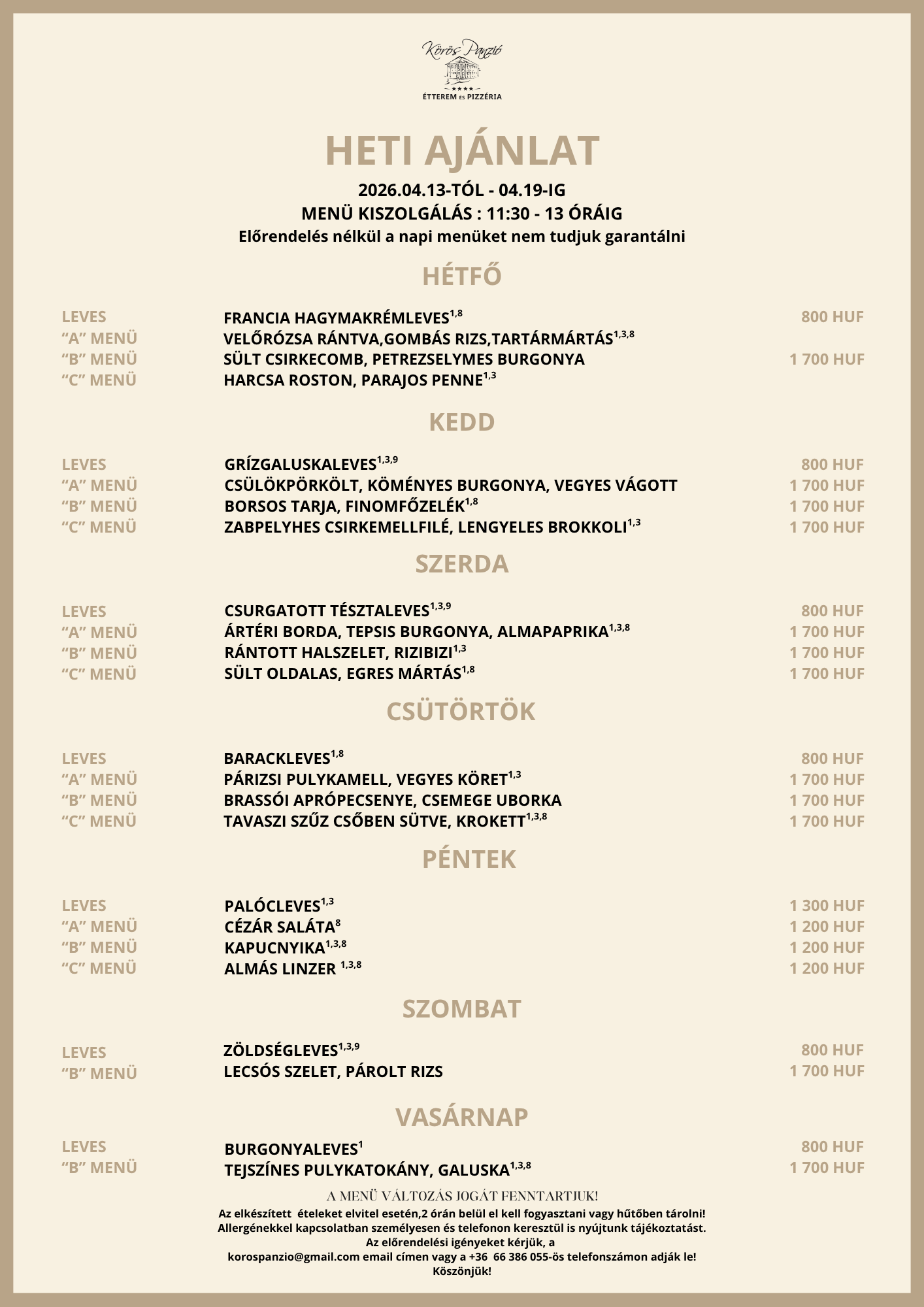 Továbbá tájékoztatjuk Önöket, hogy a menüváltozás jogát továbbra is fenntartjuk. Előrendelés nélkül a napi menüket nem tudjuk garantálni.
